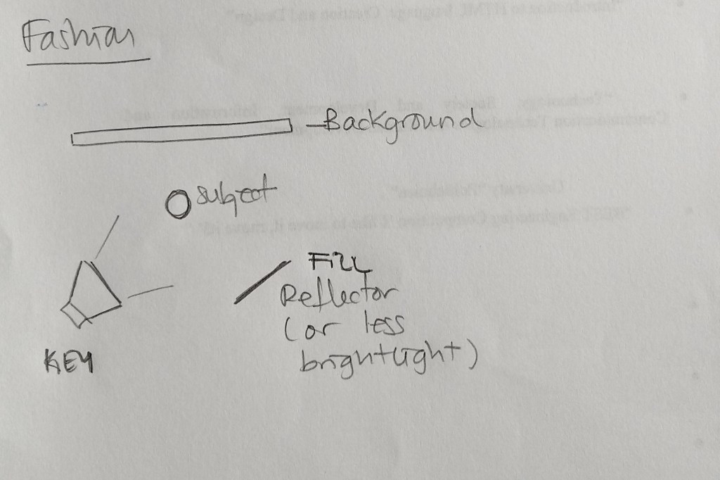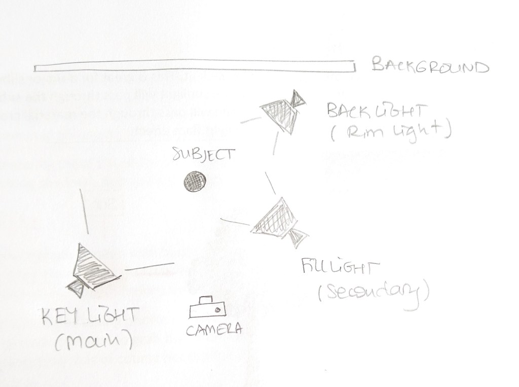 3 – Draw a diagram of and describe the three-point lighting setup.