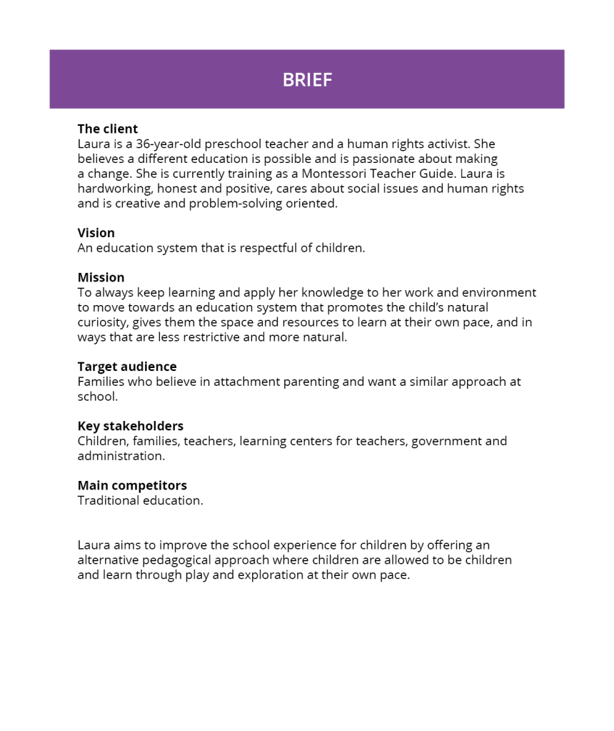 Gather your findings and analyse the one or two interviews you’ve done. Then type up your findings and create your own brief. Your brief should include any insight you may have gained from these interviews. The purpose of the brief is to create a brand. This step of the assignment is the creation of a brief only – you do not have to develop the brand yet. Publish your data from Step 1 and your brief in Step 2 in PDF format. Make sure that the document is neat and well presented.