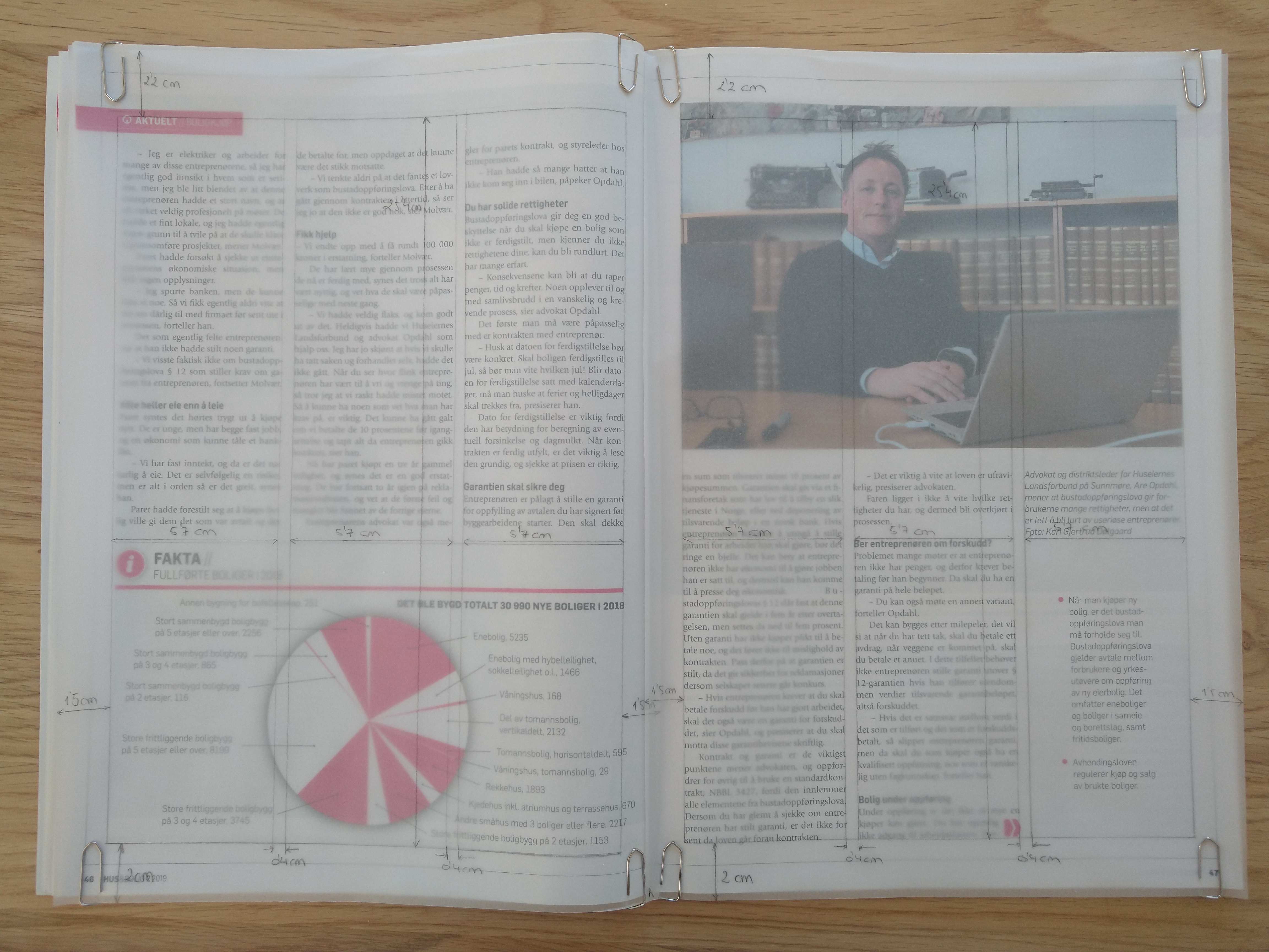 I decided to use the magazine Hus & Bolig. The three spreads I chose are based on a three-column grid, like most of the pages in the magazine. All the pages selected have a mid-range amount of text, which works well with this type of grid. All three spreads have large images/graphics; the first and the last one have an asymmetric distribution between picture and text, while the second one is symmetrically divided.